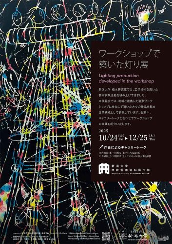 本企画展は、市民参加型のワークショップを取り入れた空間演出作品です。 参加者には、「住みたい街」 をテーマに、スクラッチという描画技法を使って作品を制作してもらいました。令和6年に開催した西区アートフェスティバル (黒埼市民会館) で行ったスクラッチワークショップで制作された80点の作品に加え、令和7年に新潟市西区内野町で開催した「うちのアートプロジェクト」でのワークショップで提供された作品を用いて、集合体としての光のオブジェや、ペンダント照明などとして構成しています。